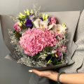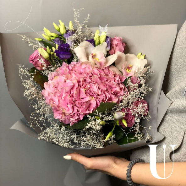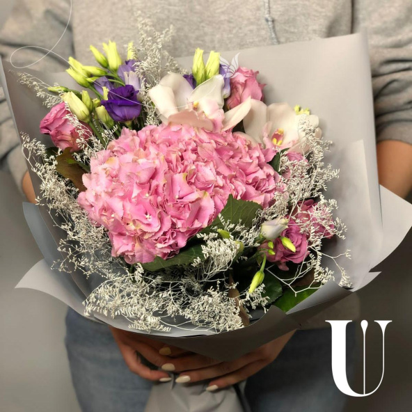 Авторский букет из голубой гортензии, белых роз и белых эустом в дизайнерской упаковке