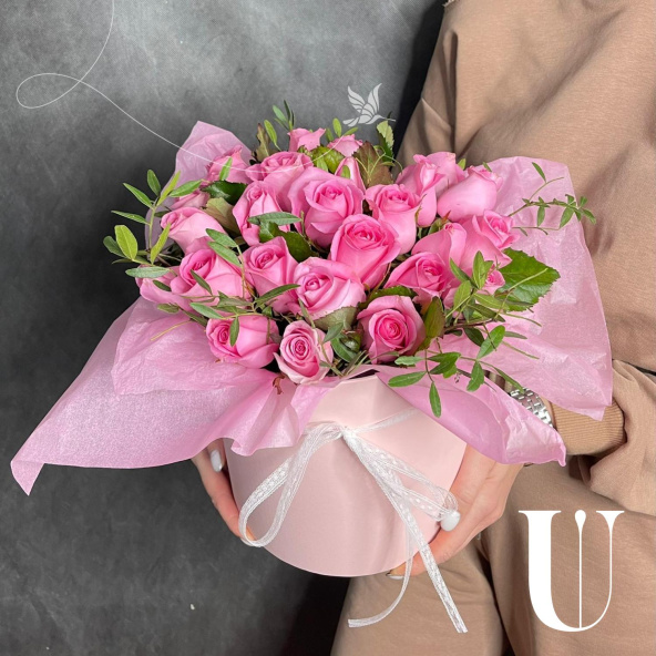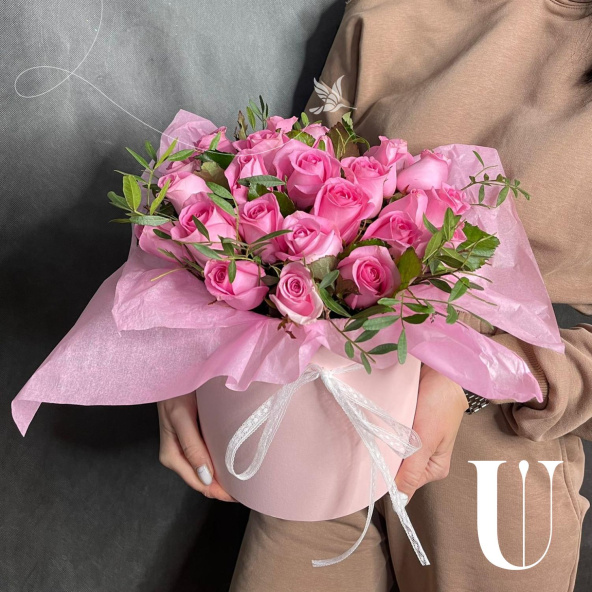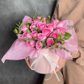 Цветочная композиция в нежных тонах из роз, гвоздик и тюльпанов в шляпной коробке