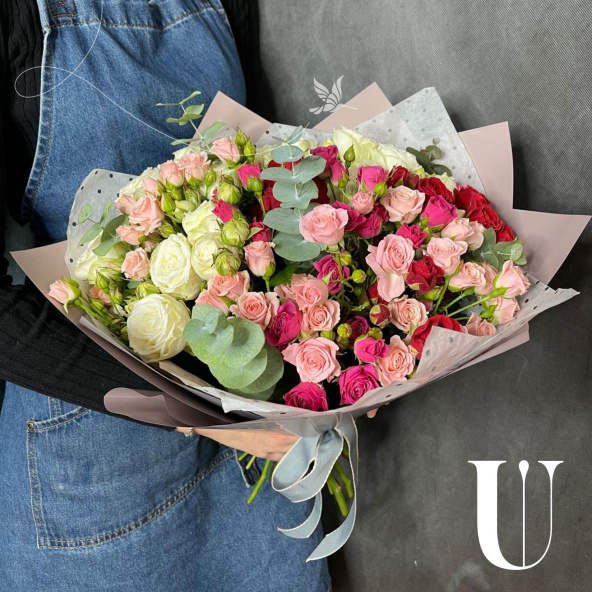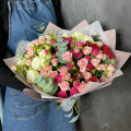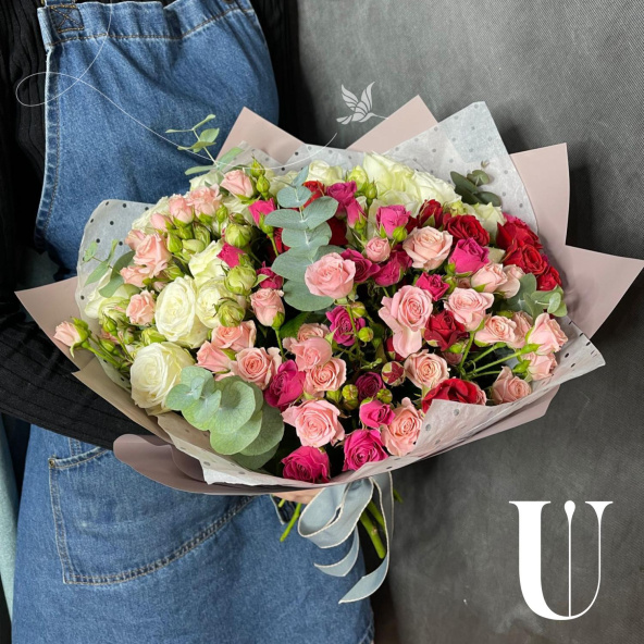 Букет из 21 белой кустовой хризантемы в розовой упаковке